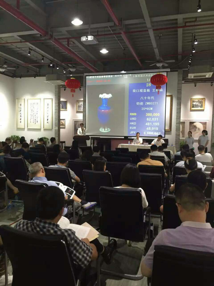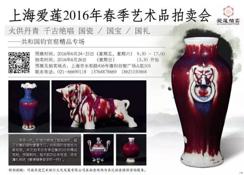 2016年6月26日13时45分,上海爱莲艺术品拍卖有限公司2016春季艺术品拍卖会在上海市雍和创智广场召开。本次拍卖会由第三届中拍杯全国拍卖师大赛“铜槌奖”获得者邹艳萍女士担任拍卖师。本次拍卖会集中为“火供丹青·千古绝唱·国瓷 / 国宝 / 国礼——共和国钧官窑精品”专场,共101件艺术品参与拍卖。